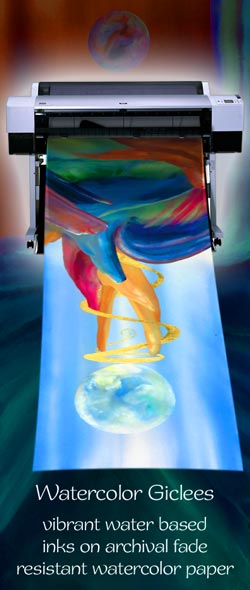 Giclee, (pronounced "ghee-clay") is from the French verb gicler, meaning "to squirt" or "to spray" and describes a high-resolution large-format advanced technology specifically for fine art reproduction. Images are produced on a computerized ink jet printer with the capability to output a variety of sizes without compromising detail or color vibrancy. This exceedingly accurate printmaking process produces over four million microscopic droplets per second using archival, fade-resistant, water based inks lasting 80 to 100 years. These droplets combine to form millions of colors on fine art papers, canvas or etching paper. This allows for a high degree of fine detail, virtually identical to the original image.