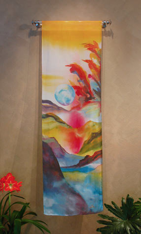 Love Element Silk Blessing "Tending the Child", one of 6 sumptuous designs embracing the five Feng Shui Elements, Earth, Metal, Water, Wood and Fire and the sixth Worlds of Good Fortune signature Element of Love. Engaging with these flowing works ot art awakens and releases blessings, enhancing creativity, harmony and effortless flow.